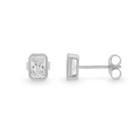 Make a statement of elegance with our stunning EverGem 9ct White Gold Emerald Cut Cubic Zirconia Stud Earrings. Crafted with care and precision, these Cubic Zirconia bezel set studs feature a mesmerizing emerald cut Cubic Zirconia hat will catch everyone's eye. The perfect size at 5 x 4mm, these earrings will add a touch of class and sophistication to any outfit. Elevate your style and feel confident with our high-quality, luxurious earrings.