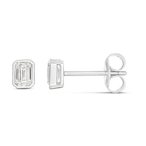 Experience luxury and elegance with these stunning 9ct White Gold bezel set Emerald Cut Lab Grown Diamond studs, showcasing a total of 0.50ct of brilliant D/F VVS/VS diamonds.