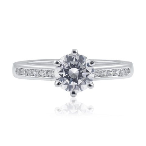 Elevate your proposal with the sophisticated 18ct white gold 6 claw Diamond Engagement Ring, complete with channel-set diamond shoulders. This timeless ring will not only ensure an affirmative response, but also bring an additional shimmer into your loved one's life.