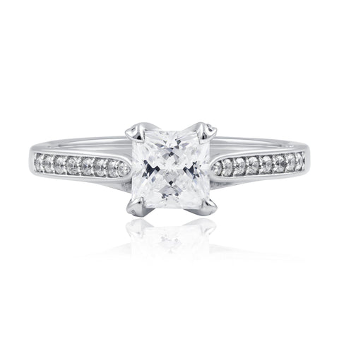 1ct Princess cut Lg diamond with 0.64ct bead set shoulder diamonds down the band and on the sides.Wrap around centre claws set in Platinum