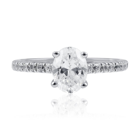 The platinum lab-grown diamond engagement ring features a stunning 1.28ct total diamond weight and a sophisticated design, with four claws to securely hold the sparkling center diamond and additional diamonds set along the shoulders. You can customize this piece with natural diamonds for a quote.