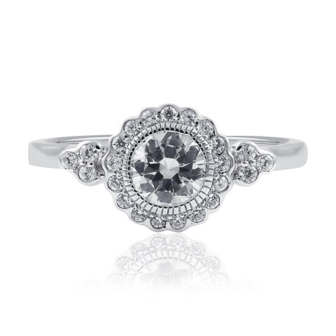 Expertly crafted, this stunning Art Deco-inspired ring features a brilliant 0.50ct lab-grown diamond as its centrepiece, radiating timeless elegance. Surrounding the main diamond are 23 meticulously set small lab-grown diamonds, creating a breathtaking display of sparkle with a total diamond weight of 0.73ct. This beautiful piece is also available with natural mined diamonds upon request, offering a bespoke option for those who appreciate the allure of naturally sourced stones. Whether worn as an engagement ring or a statement dress accessory, this ring embodies sophistication and vintage charm.