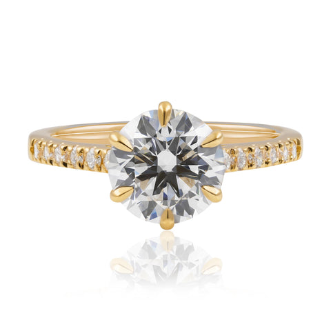 Experience eco-friendly, ethically sourced diamonds without compromising quality or elegance with this 2ct Lab Grown D/Vs Diamond 6 Claw Engagement Ring in 18ct yellow gold. The band features diamonds down the band, providing an environmentally conscious and ethically responsible choice for your special occasion. Discover the beauty and sustainability of lab grown diamonds today.