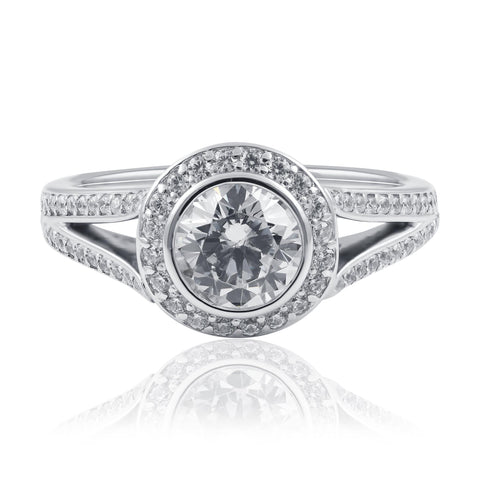 Split diamond set band Halo white gold engagement ring. 1ct Lab Grown Bezel set diamond in the centre with a diamond set halo. D/F Vs diamonds. Natural diamond price starts at $15,000