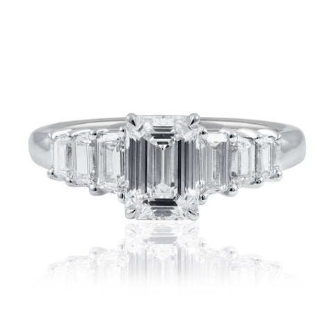 Add a touch of elegance to your ensemble with this exquisite 2ct TDW Emerald Ring. It showcases a 1 x 1.5ct F/Vs Emerald-cut center diamond and 6 tappered emerald-cut diamonds totaling 0.80ct, meticulously hand-picked for their exceptional quality, cut, and sparkle. Crafted from 14ct white gold, this timeless ring is expertly designed and carefully crafted to exude sophistication and style.