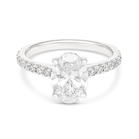 Experience pure luxury with our 18CT White Gold Hiddn Halo 2.00ct Oval Solitaire lab grown diamond ring. The stunning claw set shoulder stones and hidden halo add an exquisite touch, for a total diamond weight of 2.50ct. Revel in the highest quality with flawless D/E color and VS clarity, making this ring the epitome of elegance and sophistication.