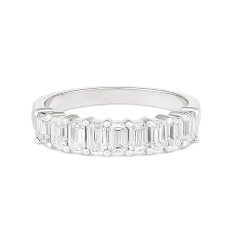 Sparkle with ethically-sourced, lab grown diamonds! This stunning, 18ct white gold wedding ring showcases 9 emerald cut diamonds totalling 1.00ct for a flawless and luxurious look. Join the growing movement of conscious consumers while celebrating your love and commitment.