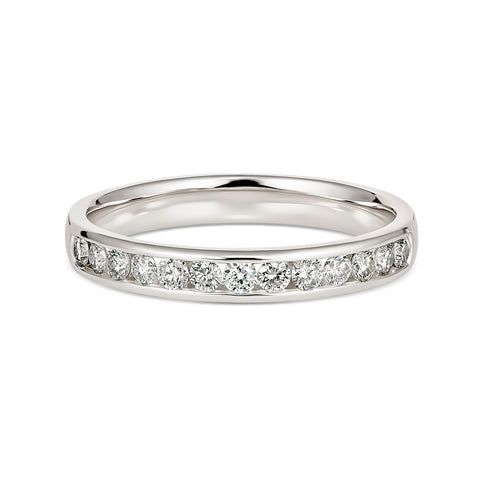 Make a statement of luxury and elegance with the Myriad Diamond 18ct white gold diamond channel set ring. With 13 sparkling diamonds totaling 0.33ct, this ring is sure to catch the eye and capture the heart. The perfect blend of sophistication and glamour, this ring will be a timeless addition to your jewelry collection. Don't settle for less, make a statement with the Myriad Diamond ring today!